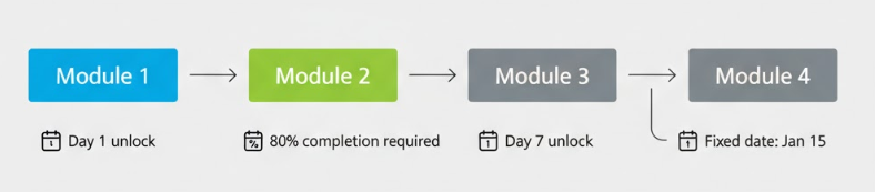 - Prerequisite rules: Module N+1 unlocks after 80% of Module N is completed.